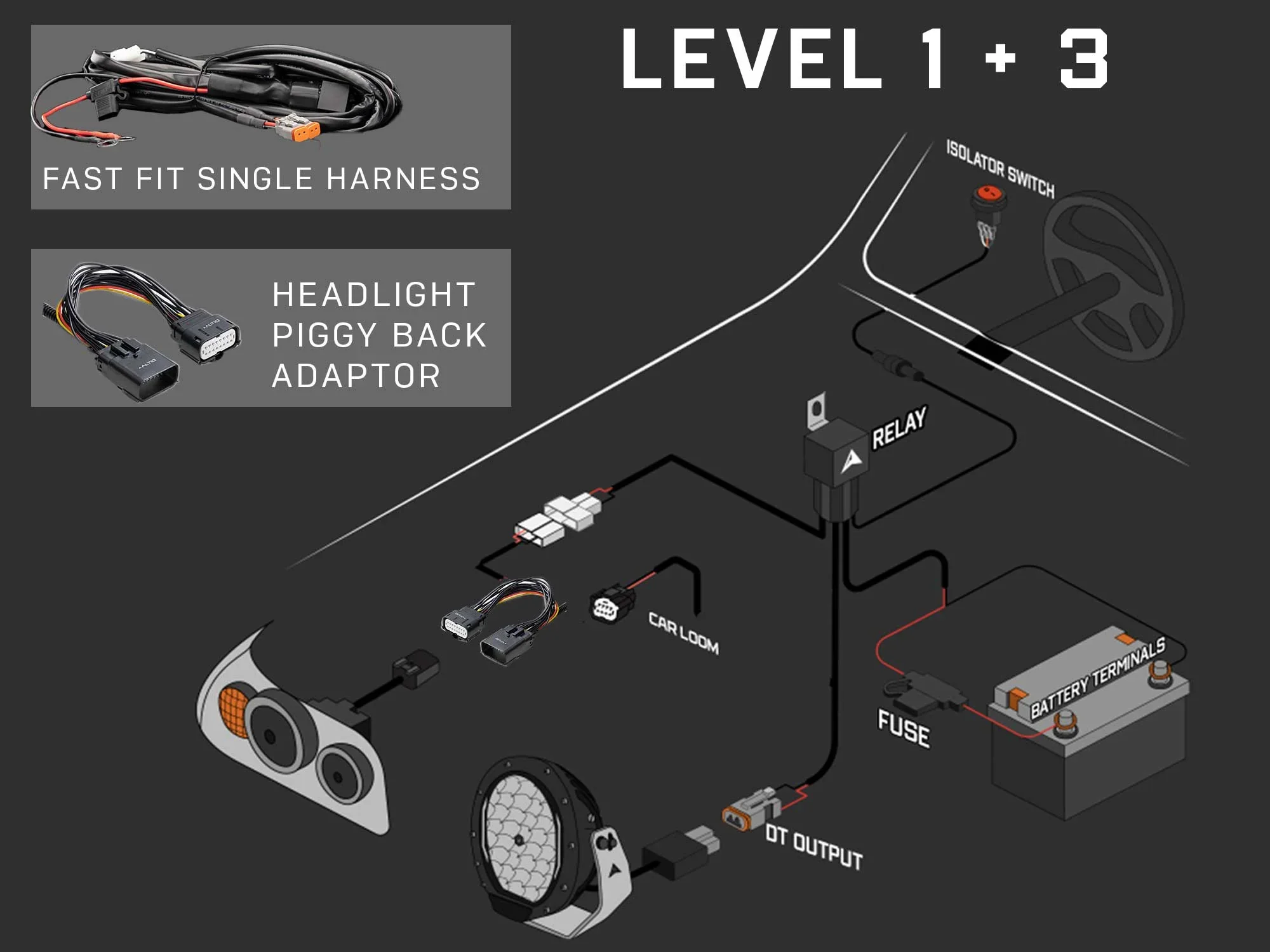Level 1 & 3 Headlights – Fast Fit Single Harness + Headlight Piggy Back Adaptor.
