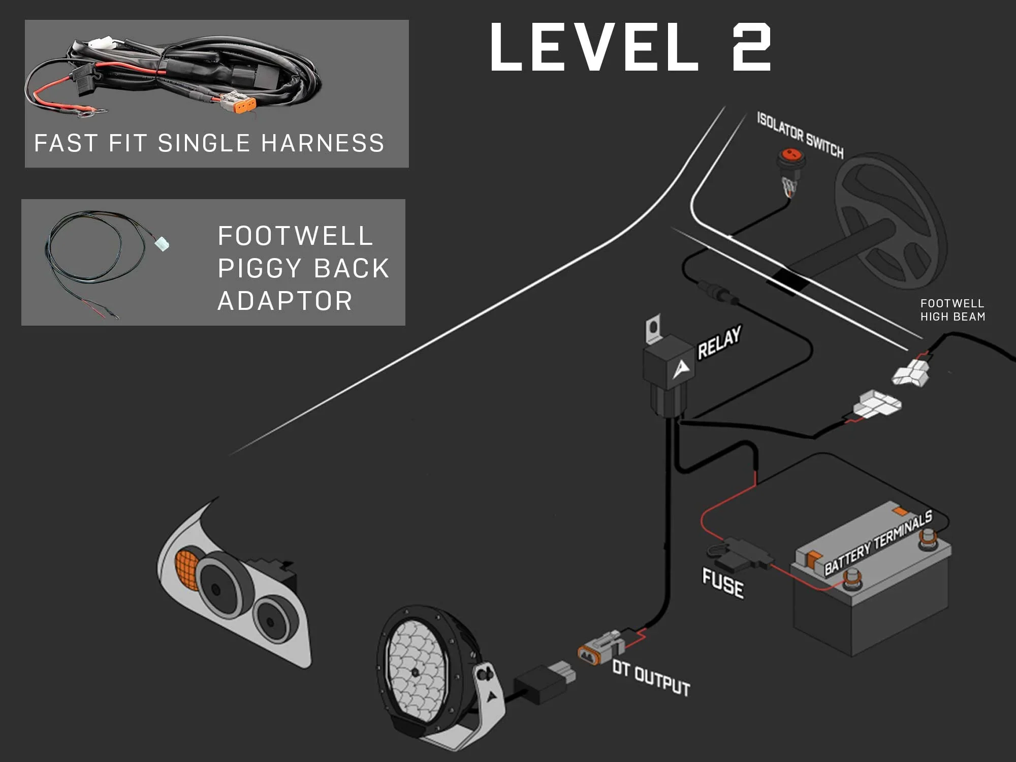 Level 2 – Fast Fit Single Harness + Footwell High Beam Piggy Back Wire.