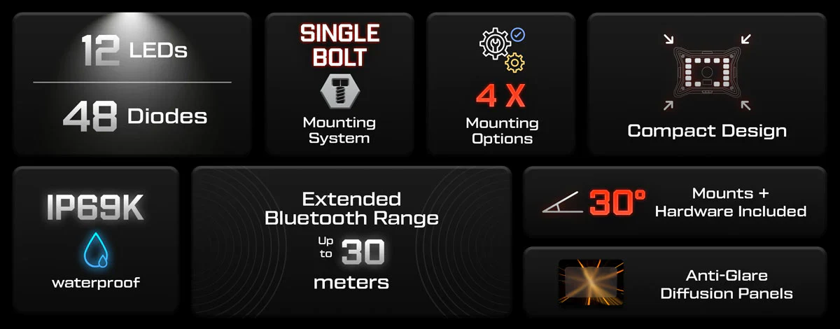Engineered for ultimate durability, the Spectrum Pro kits feature high-strength Polycarbonate Lexan lenses, high-pressure cast aluminium bodies, and IP69K waterproofing. The PCB is epoxy-filled for added resilience, and each optical lens is O-ring sealed, making these rock lights ready to endure mud, dust, heavy rain, and rugged terrain. Built to withstand the toughest off-road adventures and worksite conditions.