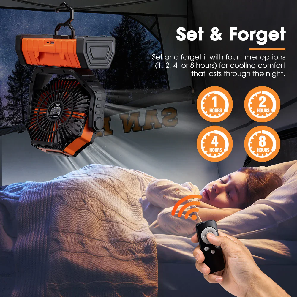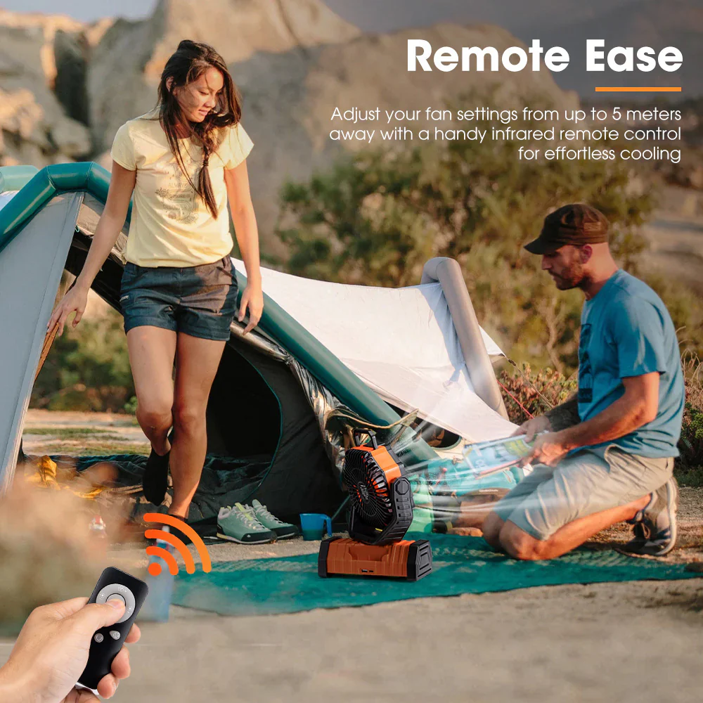 Stay cool, comfortable, and illuminated wherever your outdoor adventures take you with the San Hima 20000mAh Portable Camping Fan. Designed for tents, caravans, workspaces or picnic setups, this lightweight and rechargeable fan combines powerful airflow with versatile lighting and remote convenience. With four fan speeds, three LED brightness levels, and up to 60 hours of runtime, it delivers reliable comfort for long days and warm nights in the wild.